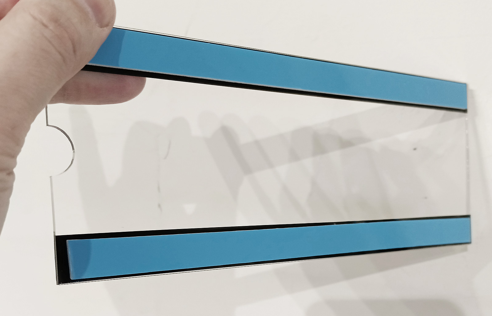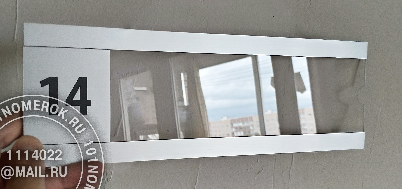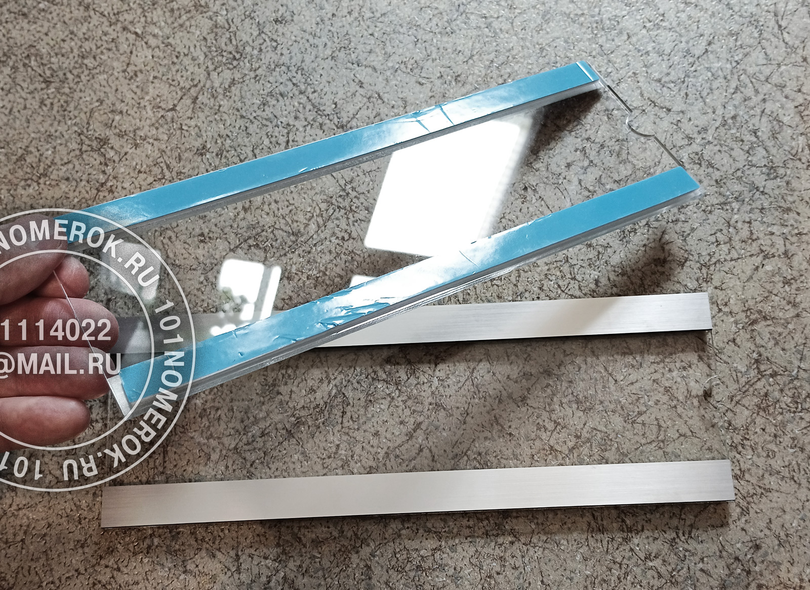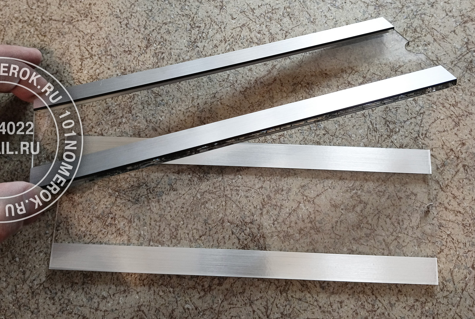 сверху на табличку клеютсядве полоски из композитного пластика 1.7 мм, обычно под металл, чтобы с внешней стороны не были видны полоски крепежного скотча.