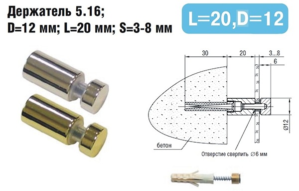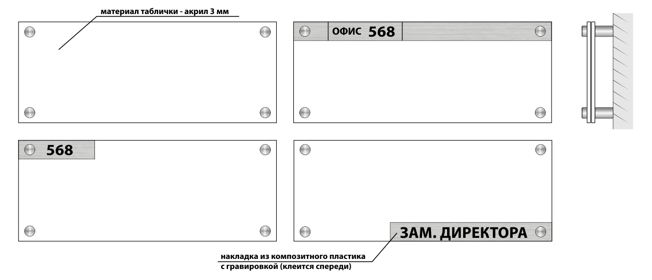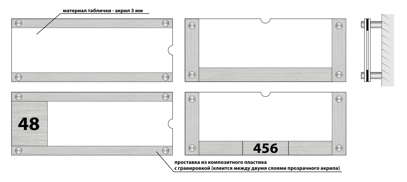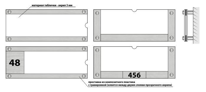 Держатели различаются по размеру и толщине. Стандартное расстояние таблички до стены: вплотную, 15 мм, 20 мм.