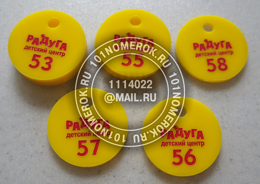 Номерки режутся из листов цветного акрила на лазерном оборудовании, что дает красивый полированный край номерка. Он приятен на ощупь и не режется.