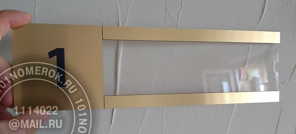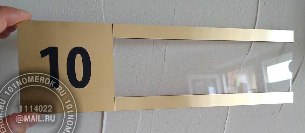 Вариант таблички - кармана для вставки листа с информацией с передними декоративными полосками из композитного пластика. Если сделать верхнюю полоску чуть шире, на нее можно отгравировать номер кабинета или название должности, либо другую информацию.