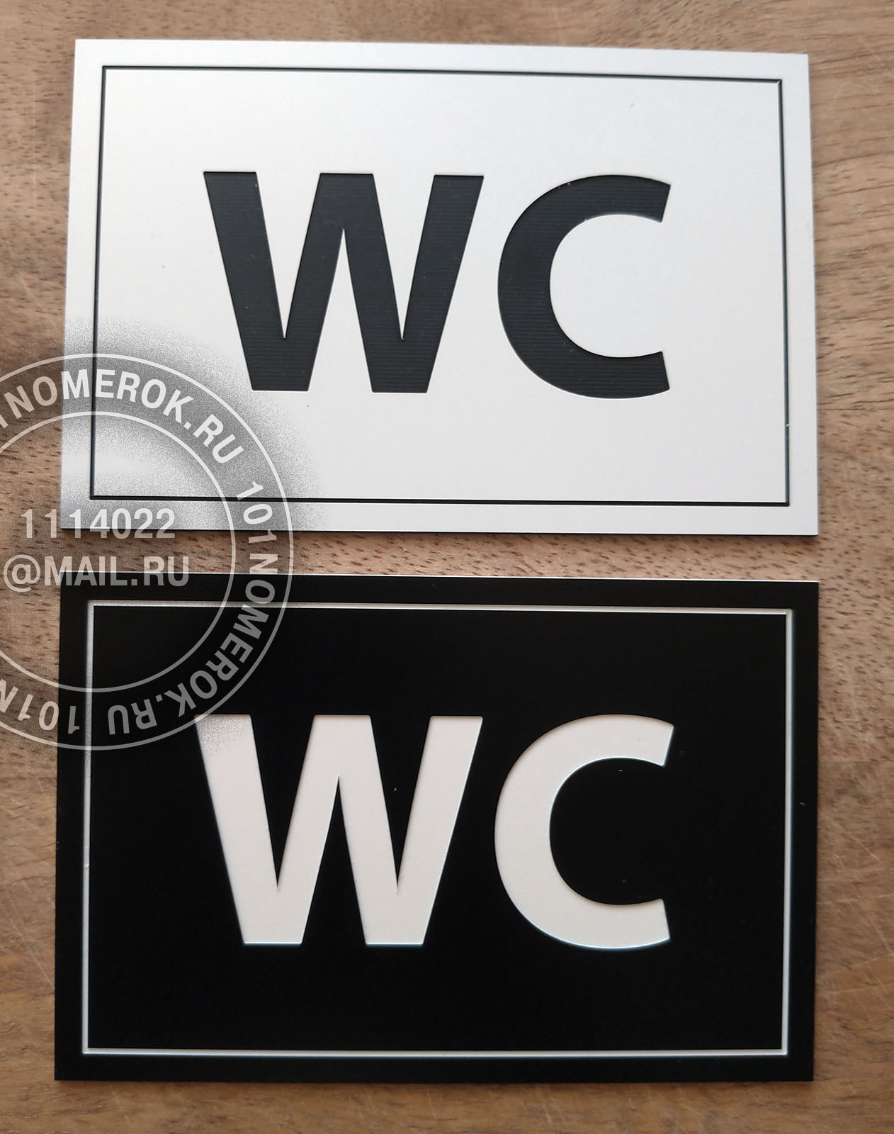 Стандартный материал таблички для туалета - композитный пластик. Это золотая середина в материалах - не такой дорогой как латунь, но и не зрительно дешевый, как ПВХ с печатью.